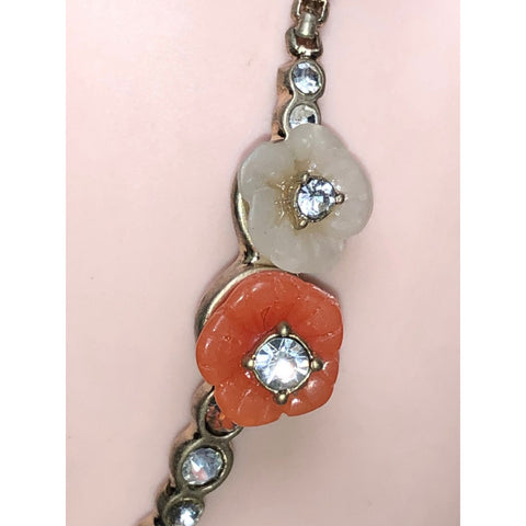 Bring a touch of feminine charm to your look with this Chloe & Isabel bracelet. Designed with a delicate gold-tone chain, it features three carved floral accents in soft neutral and coral tones, each adorned with a sparkling crystal center. Additional crystal stations along the bracelet add extra shimmer, creating the perfect mix of elegance and playfulness. Lightweight and adjustable, this bracelet is ideal for both everyday wear and special occasions.
