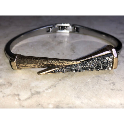 Sleek, edgy, and effortlessly modern — the Amulet Hinged Bangle Bracelet exudes bold sophistication with a touch of mystique. Featuring a tapered spike-inspired design, this bracelet gleams in a gunmetal and antique gold-tone mix, adorned with crushed hematite crystals that shimmer with dark, captivating sparkle.