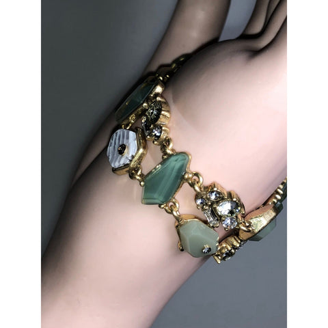 This bracelet features an eclectic mix of mint green, sage, and white stones in various geometric shapes, all set in a warm gold-tone metal. Scattered throughout are sparkling clear crystals and baguette accents that add a refined shimmer. The design combines opaque and faceted elements for visual texture and depth, creating a bold yet elegant look that wraps beautifully around the wrist.
