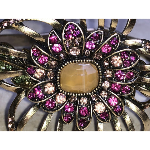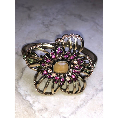 This bold statement bracelet features an oversized openwork flower design in antique gold-tone metal, encrusted with sparkling crystals in shades of fuchsia, blush, and green. At its center sits a faceted yellow stone, adding a touch of contrast and warmth. Its intricate petal detailing and vivid colors make it a standout accessory with a vintage-inspired, glamorous flair.