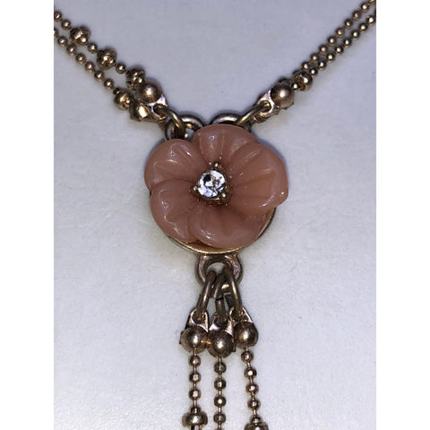Graceful and refined, the Hanami Y-Necklace captures the delicate beauty of spring blossoms in a timeless design. A single hand-enameled flower in a warm blush tone sits at the center, accented by a sparkling crystal and a cascade of fine gold-tone chain tassels that create soft movement and shine. The dainty, double-layered beaded chain adds a touch of texture and elegance, making this piece perfect for both everyday wear and special occasions.