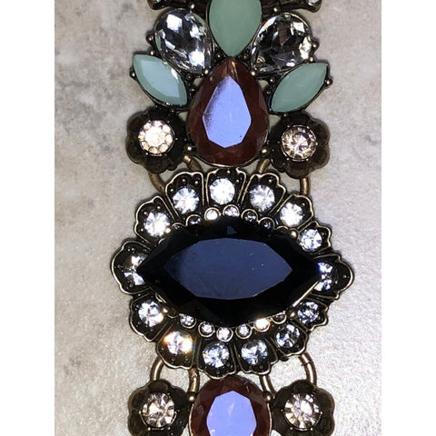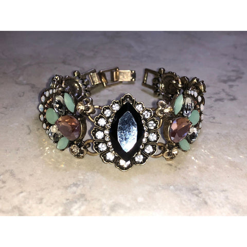 Make a bold and timeless statement with this Chloe & Isabel vintage-inspired bracelet. Crafted in an antique gold-tone finish, the bracelet showcases a striking centerpiece with a faceted black marquise stone framed by sparkling crystals. On each side, clusters of pastel green enamel petals, lavender-toned gems, and clear crystal accents create a stunning floral motif. With its intricate design and secure fold-over clasp, this piece is perfect for adding elegance and glamour to evening wear or special occasions.