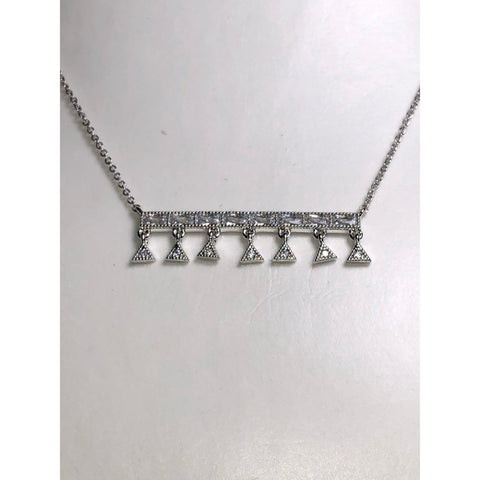 Sleek, modern, and effortlessly chic, the Pavé Triangle + Baguette Pendant Necklace combines geometric design with timeless sparkle. A row of glimmering baguette-cut crystals forms a clean, horizontal bar, from which six petite pavé-set triangles dangle delicately, catching the light with every movement. Finished in a polished silver tone, this piece strikes the perfect balance between minimalism and sophistication.