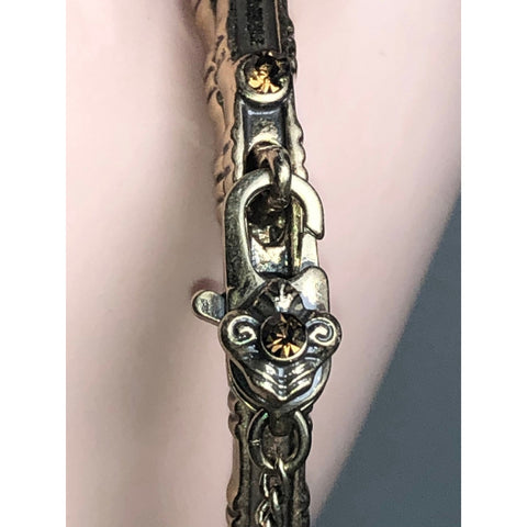 Its intricate design and slim silhouette make it ideal for layering or wearing solo for a hint of graceful sparkle. A hinged clasp with safety chain ensures both comfort and security — the perfect finishing touch for any formal or romantic look.
