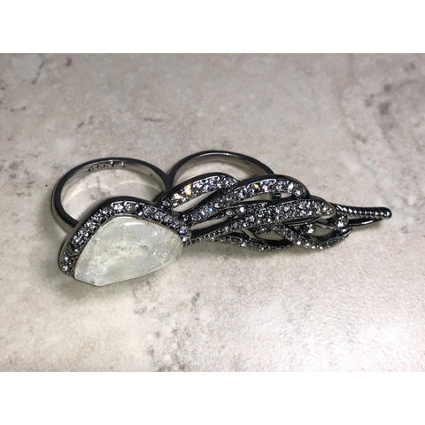 Take flight in brilliance with the Silverwing Statement Ring, a stunning fusion of artistry and modern edge. Crafted in an antique silver-tone finish, this ring features a fluid, wing-inspired design that wraps elegantly across the hand. The openwork structure is encrusted with shimmering pavé crystals, centered by a luminous, iridescent stone that catches light with every movement—reminiscent of moonlight on water.