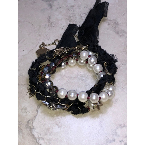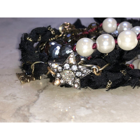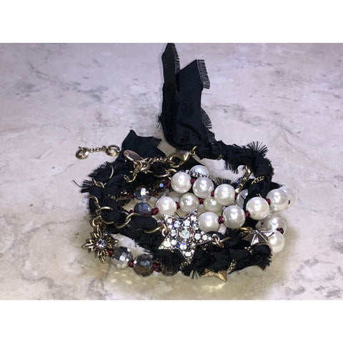 Elegant yet edgy, the Souviens Wrap Bracelet captures the spirit of vintage Parisian charm with a modern twist. This multi-strand design intertwines black fabric ribbon, faux pearls, and faceted metallic beads, creating a rich mix of texture and shine. Accented with crystal-embellished star and floral charms, this bracelet evokes memories of midnight soirées and starlit streets.