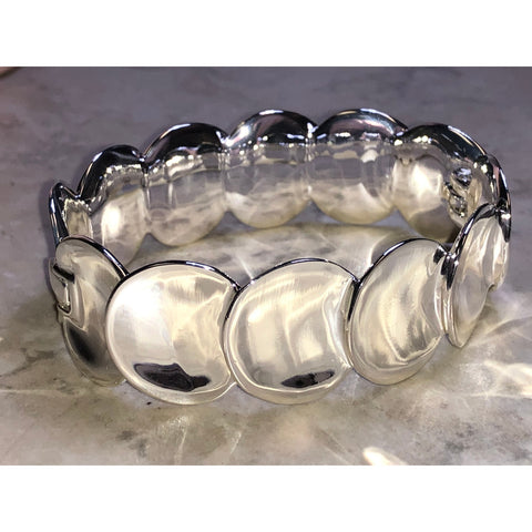 Bold yet refined, the Chloe + Isabel Anniversary Silver Bracelet features a striking row of polished, domed discs that create a sleek, modern statement. Finished in a luminous silver-tone, each rounded link reflects light beautifully, giving the bracelet a smooth, mirror-like shine.