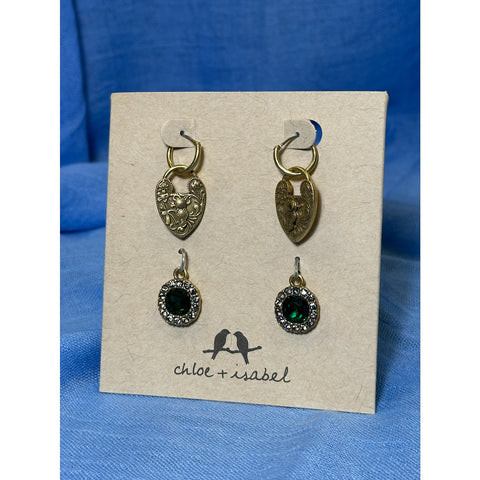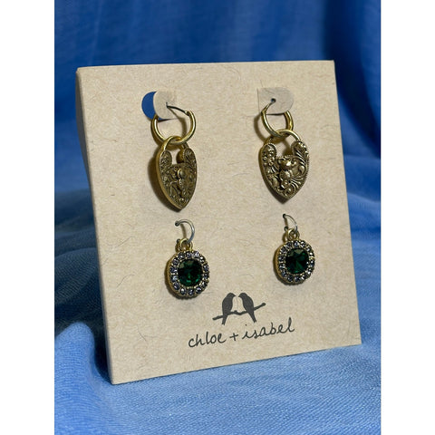 These Chloe + Isabel gold-tone hoop earrings feature interchangeable charms, including engraved heart pendants and sparkling green gemstone drops. Designed for versatility, they can be worn multiple ways to suit everyday or dressy looks.