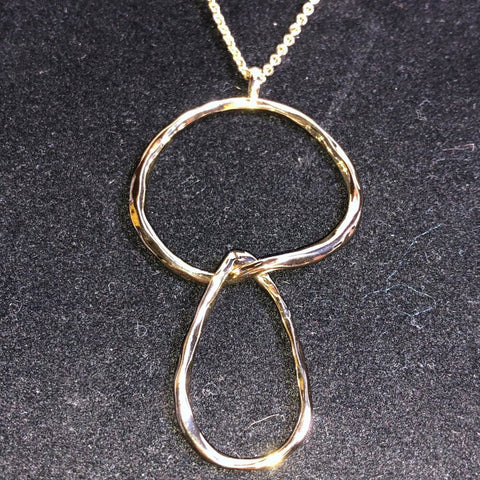 Minimalist design meets sculptural elegance in the Modern Muse Linked Loops Pendant Necklace. This effortless statement piece features two organically shaped, hammered metal loops—one round, one teardrop—interlocked to create a fluid, contemporary silhouette. The mixed metal tones add subtle contrast, making it a versatile accessory that pairs beautifully with both gold and silver jewelry.