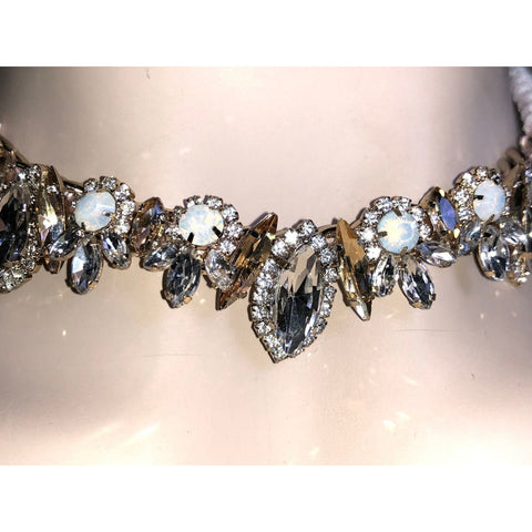 The Chloe + Isabel Jolie Collar Necklace is the epitome of modern romance and vintage-inspired glamour. Featuring a stunning arrangement of hand-set glass crystals in soft opalescent hues and champagne tones, this statement piece catches the light from every angle.