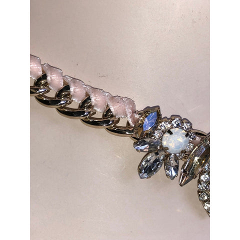 Each crystal is artfully arranged in floral and teardrop motifs, set in a warm gold-tone finish and paired with a blush pink fabric-wrapped chain that adds a soft, feminine touch. Designed to rest beautifully along the neckline, this necklace transforms any look—from casual chic to evening elegance.