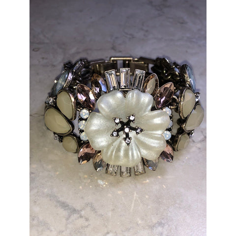 Bold, breathtaking, and exquisitely feminine, the Gilded Petals Statement Floral Cuff Bracelet brings couture-inspired elegance to your wrist. Anchored by a luminous sculpted pearl-like blossom, this bracelet blooms with an artful mix of soft neutral gemstones, smoky marquise crystals, and shimmering icy blue accents.