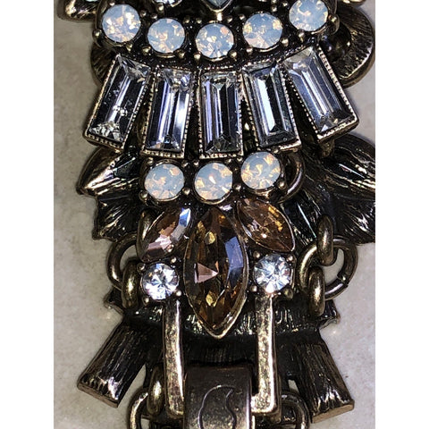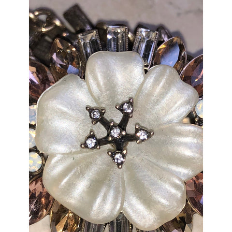 Each petal and crystal is carefully framed in warm antique gold, creating a luxurious contrast that enhances the bracelet’s vintage charm. The dimensional floral centerpiece is surrounded by radiating baguette crystals, offering a dazzling burst of light with every movement.