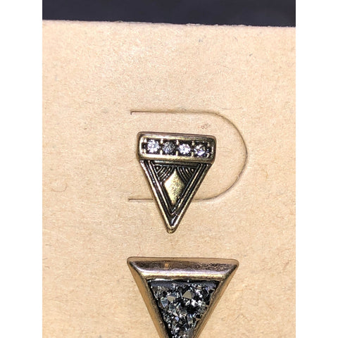 Make a modern statement with this chic Chloe + Isabel triangle stud earring set, featuring two complementary pairs designed for versatile styling. The set includes one pair of sleek pavé crystal triangle studs and one pair of textured druzy-style triangle studs, both finished in a warm gold-tone setting.