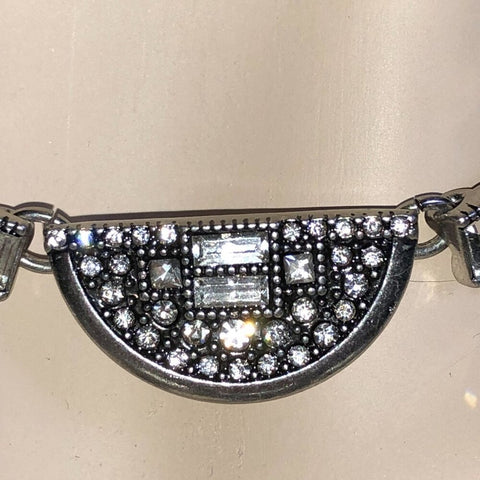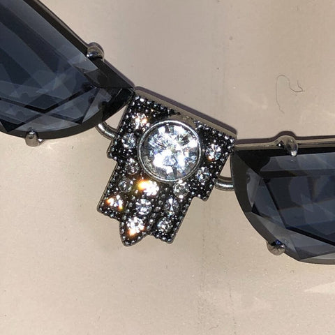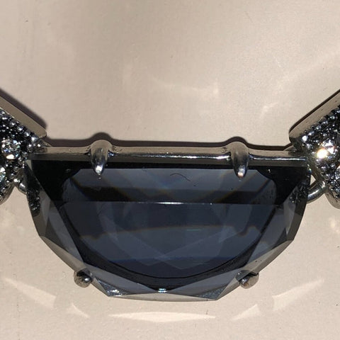 Featuring bold, faceted midnight-blue glass stones paired with glittering crystal pavé fan accents, this necklace delivers dramatic contrast and sophisticated shine. The geometric half-moon and baguette stone detailing at the neckline highlights the collection’s Deco inspiration, creating a striking layered look in a single, seamless piece.