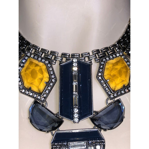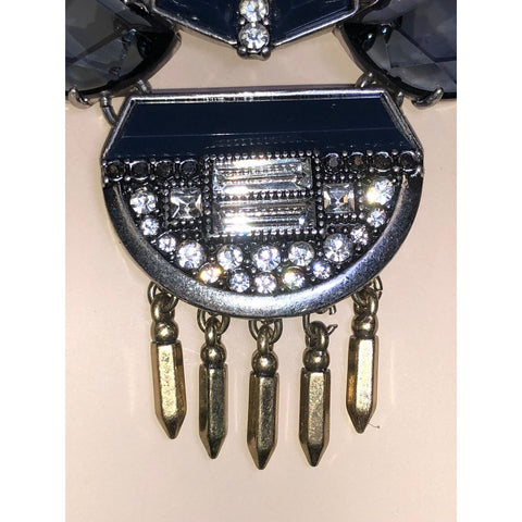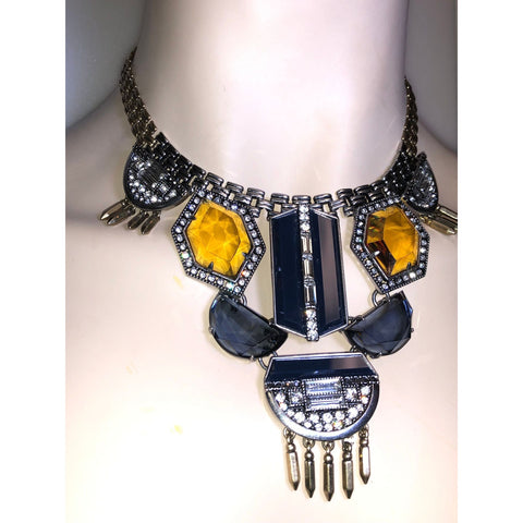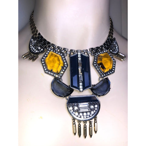 Command attention with the striking Imperial Gem Warrior Statement Necklace, one of Chloe + Isabel’s most dramatic and architectural showpieces. Inspired by regal armor and ancient artistry, this necklace blends bold geometry, intricate metalwork, and brilliant jewel tones into a design that feels powerful, modern, and fiercely glamorous. A series of sculptural elements—faceted smoky crystals, deep navy panels, and radiant golden-yellow gemstones—are bordered by shimmering pavé settings, adding dimension and high-impact sparkle. The central drop features a half-moon medallion adorned with crystal detailing and finished with antique gold-tone spear charms, evoking strength and sophistication. Set on a textured, antique metal chain, this piece sits proudly at the collar, transforming any outfit into a statement of confidence and artistry.