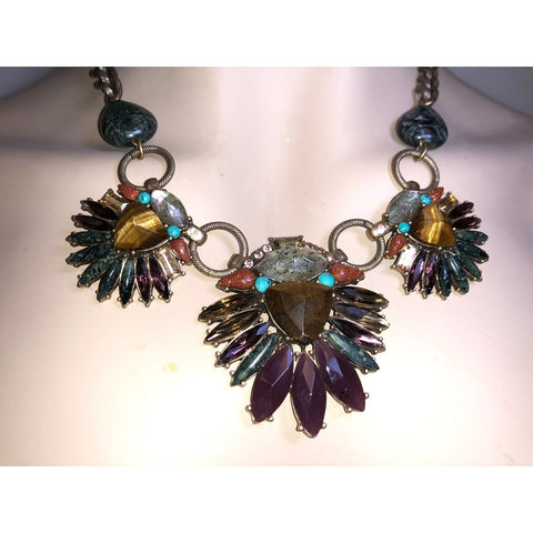 Bold, artistic, and breathtakingly detailed, the Midnight Mirage Statement Necklace captures the adventurous spirit of Chloe + Isabel’s most iconic designs. This eye-catching piece features a mesmerizing mix of faceted gemstones, marbled cabochons, and multi-colored crystal accents, arranged in a stunning fan-shaped motif that evokes exotic wings and celestial symmetry. Rich jewel tones—deep amethyst, emerald green, smoky topaz, and shimmering aqua—come together beautifully against the antique gold-tone setting. Sculpted rope-texture rings and oversized marbled stones along the chain add an extra layer of artisan detail, making this necklace a true wearable work of art. Perfect for those who love dramatic, collectible statement pieces, this necklace transforms any outfit into a showstopping look.