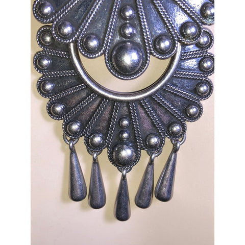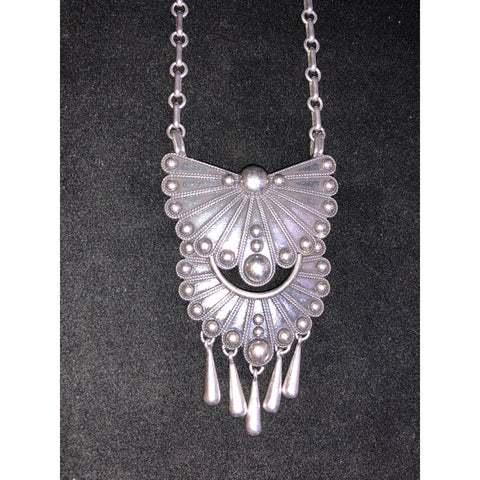 Inspired by the artistry and craftsmanship of Mexican silver jewelry, the Taxco Statement Pendant Necklace embodies bold elegance and sculptural beauty. This striking piece features an intricately detailed fan-shaped pendant with raised beaded accents and teardrop dangles that create graceful movement and texture. Finished in a deep, oxidized silver tone, the necklace exudes a rich, vintage-inspired sophistication reminiscent of traditional Taxco silversmithing.