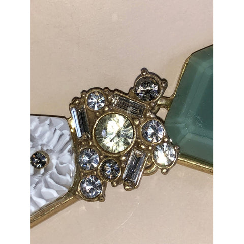 The Chloe + Isabel Zen Garden Statement Necklace is a bold and artistic piece inspired by the serene beauty of a Japanese zen garden. This striking necklace features faceted geometric resin stones in rich jade green and textured ivory, accented by clusters of sparkling crystals in both round and baguette cuts.