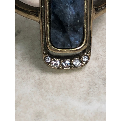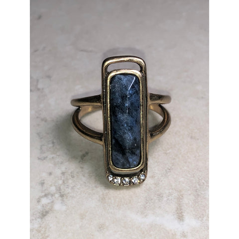 The Chloe + Isabel Aurora Statement Ring is a bold yet sophisticated piece that blends modern design with organic beauty. Featuring a striking elongated rectangular stone in deep midnight-blue tones, this ring is framed in a warm gold-tone setting with a subtle row of pavé crystal accents for added sparkle.