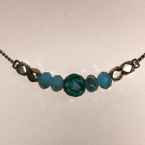 The top layer features delicate teardrop-style beads that add shimmer and movement. The mid-layer showcases faceted beads in soothing blues and greens. The longest layer is anchored by an intricately detailed elephant charm, symbolizing luck, wisdom, and protection.