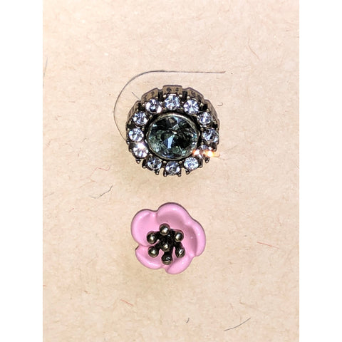 This charming Chloe + Isabel stud earring set offers two distinct styles in one versatile pairing. The first features sparkling round crystal halo studs with a soft sage-green center stone, framed by clear crystal accents for subtle brilliance. The second pair showcases delicate pink enamel flower studs with dark metal bead centers, adding a playful, feminine touch.