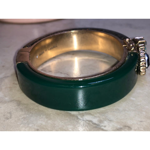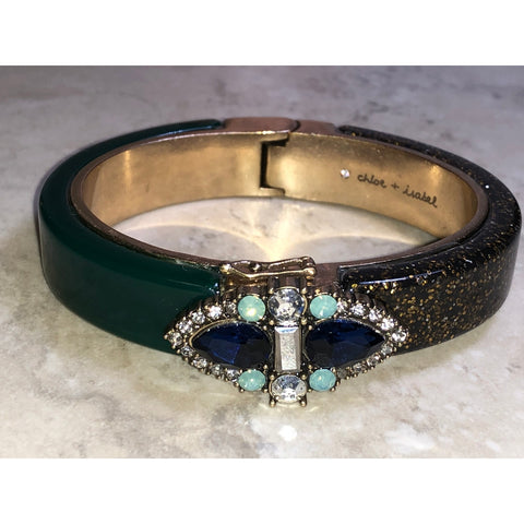 Add bold elegance to your accessory collection with this exquisite Chloe + Isabel Deco Crystal Hinge Bracelet. Designed with a striking combination of emerald green enamel on one side and black enamel infused with gold glitter flecks on the other, this bracelet delivers instant vintage-inspired glamour.