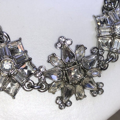 At the center rests a trio of intricately arranged ice-clear crystal clusters, forming starburst and floral silhouettes that sparkle with every turn. The combination of baguette, round, and marquise-cut stones creates a dazzling, frosted effect reminiscent of snowflakes and vintage estate jewelry.
