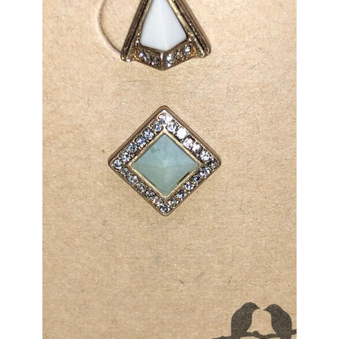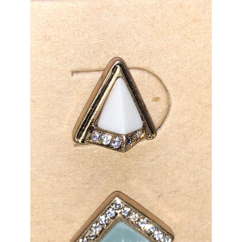 The first pair showcases elegant white triangular studs bordered by sparkling pavé crystals, offering a clean and contemporary look. The second pair features soft aqua-blue diamond-shaped stones, framed in shimmering crystal halos for a subtle pop of color and refined sparkle.
