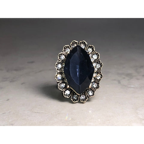 Channel timeless Parisian glamour with the Chloe + Isabel Parisian Belle Statement Ring. This dramatic piece features a bold, faceted marquise-cut black stone set at the center, framed by an ornate halo of sparkling clear crystals. The antiqued gold-tone setting adds vintage-inspired elegance, creating a look that feels both romantic and regal.