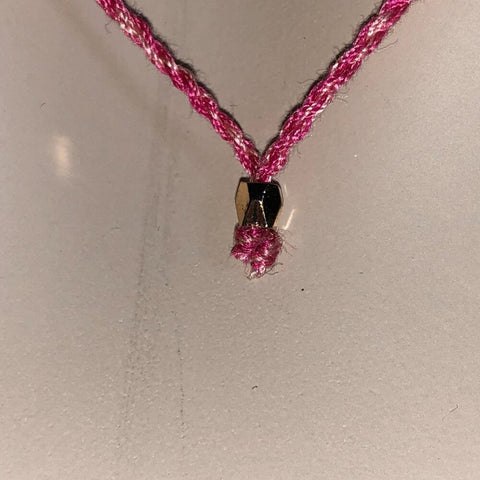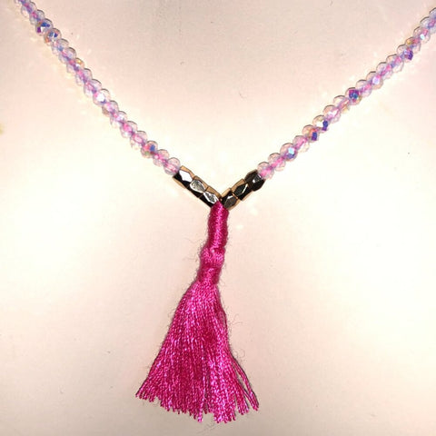 The longer strand is finished with a vibrant fuchsia tassel pendant, adding movement and a playful, artisanal feel. The shorter strand, simple and sweet, adds balance and dimension while maintaining a relaxed, easygoing style.