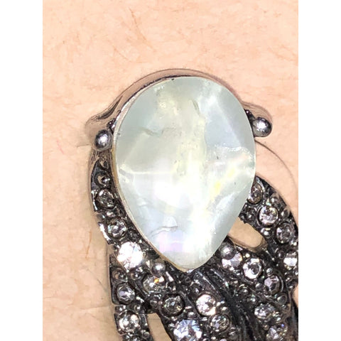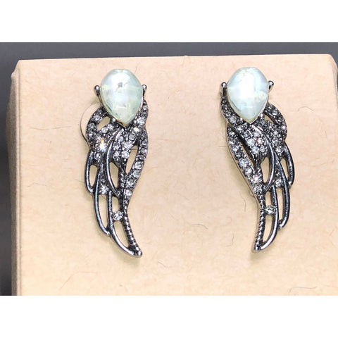 These ethereal Chloe + Isabel stud earrings feature a luminous opalescent teardrop stone set atop intricately sculpted wing-shaped metalwork. Finished in a dark silver-tone with pavé crystal detailing, the design blends soft glow with dramatic texture for a refined yet edgy look.