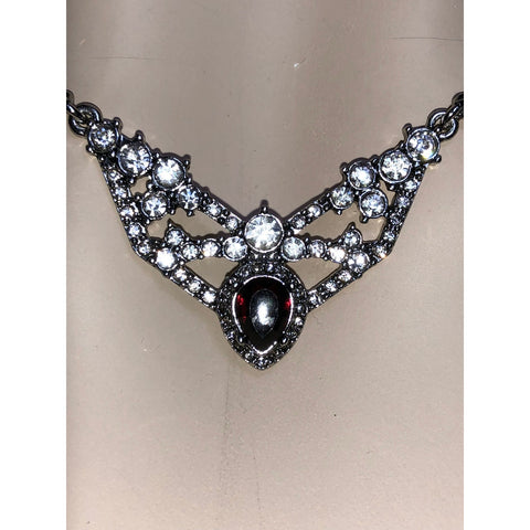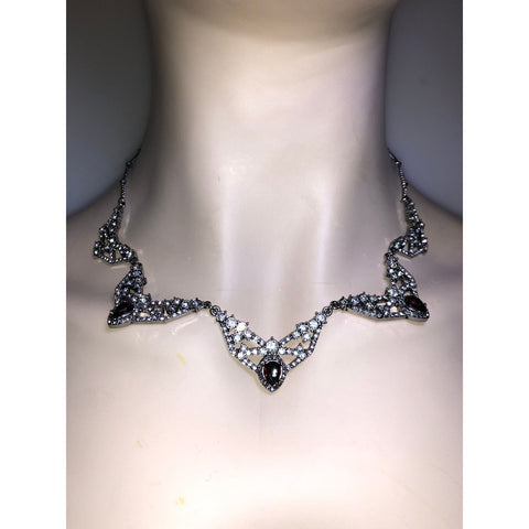 Romantic, dramatic, and exquisitely detailed, the Crimson Lace Crystal Collar brings vintage elegance together with bold, modern color. Inspired by ornate lacework, this breathtaking necklace features an intricate framework of hand-set clear crystals, creating a delicate, lace-like silhouette that drapes beautifully along the neckline. Vivid deep crimson red stones serve as the striking focal points throughout the piece, each framed with shimmering pavé crystals for a rich, eye-catching contrast. The combination of cool gunmetal metalwork, brilliant clear crystal accents, and fiery red gemstones gives this collar its unforgettable, evening-ready appeal. Lightweight yet statement-making, this necklace instantly elevates any outfit with its bold glamour and timeless sophistication