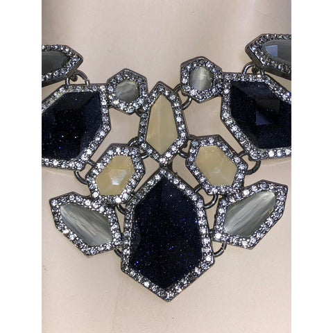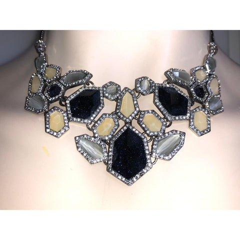 Mystical, modern, and irresistibly glamorous, the Midnight Galaxy Mosaic Statement Necklace brings celestial beauty to life through its dramatic arrangement of bold stones and shimmering crystal accents. This showstopping design features an intricate mosaic of deep midnight-blue stones with a galaxy-like sparkle, paired with soft moonstone-style greys and milky ivory gems—each uniquely shaped to create a striking geometric constellation across the neckline. Every stone is framed with brilliant pavé crystals, adding radiant light that beautifully contrasts the dark, cosmic palette. Set in a cool gunmetal-tone finish, the piece delivers high-impact glamour with a contemporary edge. Perfect for evening events, holiday celebrations, or anytime you want your jewelry to make the statement for you.