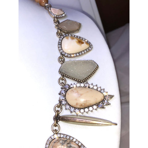 Inspired by earthy elegance and artisan craftsmanship, this Chloe + Isabel Natural Stone Statement Necklace features a stunning arrangement of desert jasper-style stones, druzy-inspired accents, and pavé crystal detailing. Each pendant showcases unique natural patterns in warm beige, sand, and caramel tones, giving the necklace an organic, desert-inspired beauty.