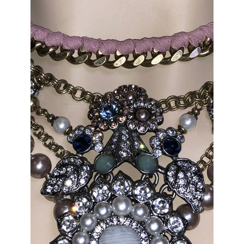At the center sits a magnificent floral pendant adorned with pearls, faceted stones, and radiant crystal accents. Layered chains cascade beautifully around it, mixing textures and tones for an ultra-luxurious profile. Every detail reflects vintage glamour with modern artistry.